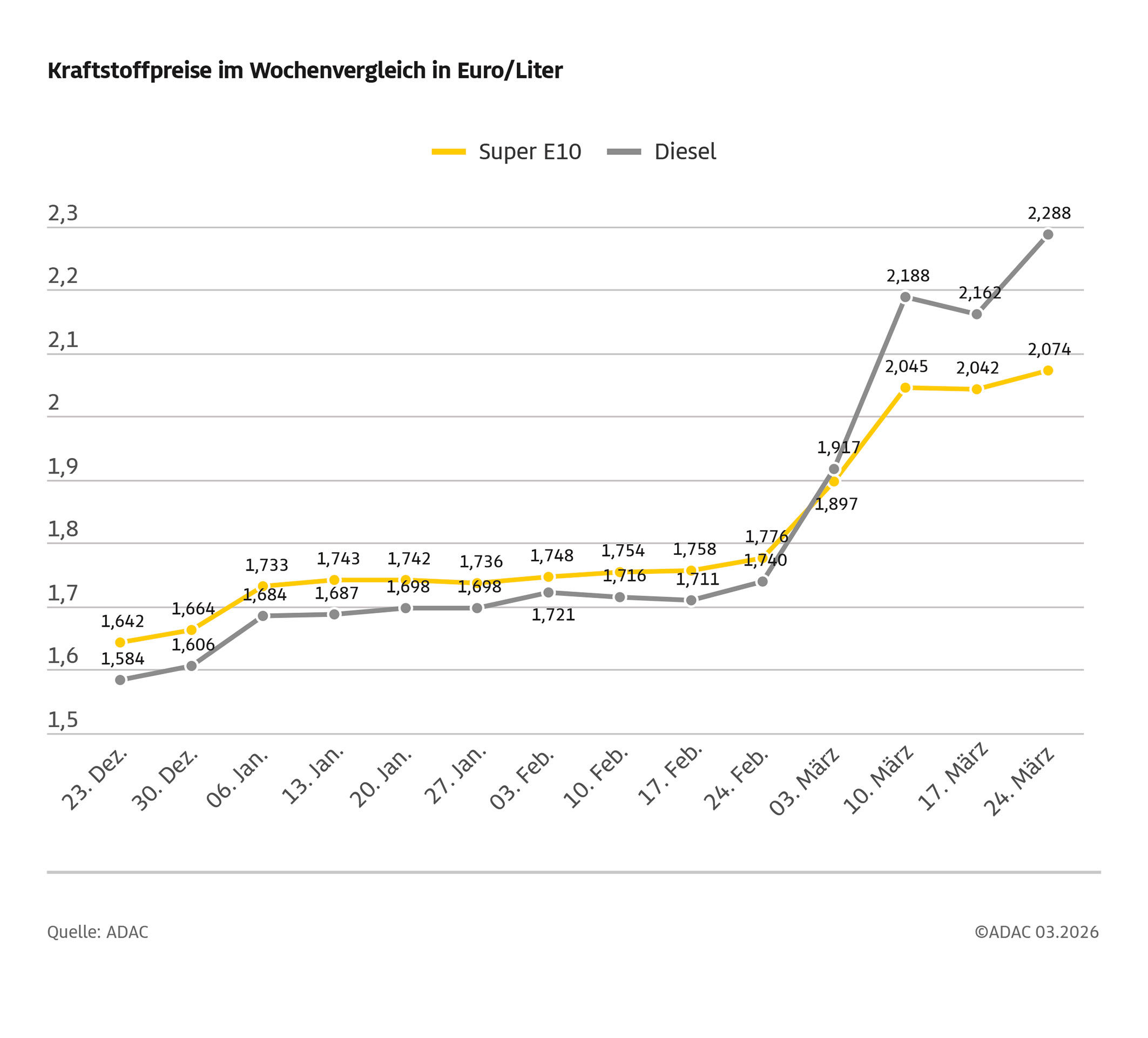 Diesel im Wochenvergleich massiv verteuert – Anstieg um 12,6 Cent – Preis für Super E10 um 3,2 Cent gestiegen – ADAC erneuert Forderung nach Absenkung der Energiesteuer